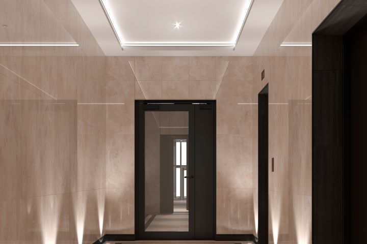 Зонирование мест общего пользования в данном проекте осуществляется за счет использования характерной отделки с применением износостойких материалов высокого качества, в том числе с использованием керамогранита.