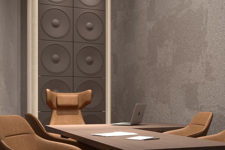 В оформлении кабинета руководителя мы предусмотрели декоративные панели, косвенно отсылающие к сфере деятельности компании.
