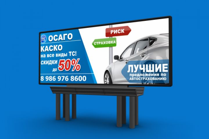 Баннер по оказанию услуг Автострахования, использовался синий цвет, он придает уверенность и доверия у клиентов. Так же в данном стиле выполнена отделка интерьера фирмы.