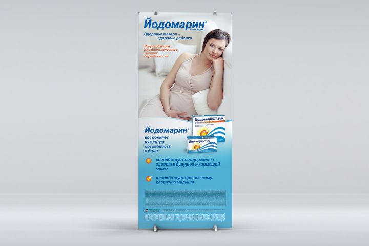Дизайн и подготовка к печати мобильного стенда «Йодомарин» для компании Берлин-Хеми.