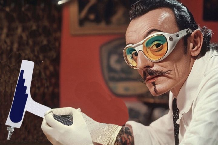 Создание нейросетью образа Сальвадора Дали. Держит в руке аппарат для удаления тату