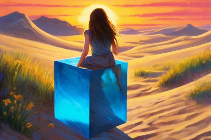 Иллюстрация "Девочка на стеклянном кубе в пустыне смотрит в даль"