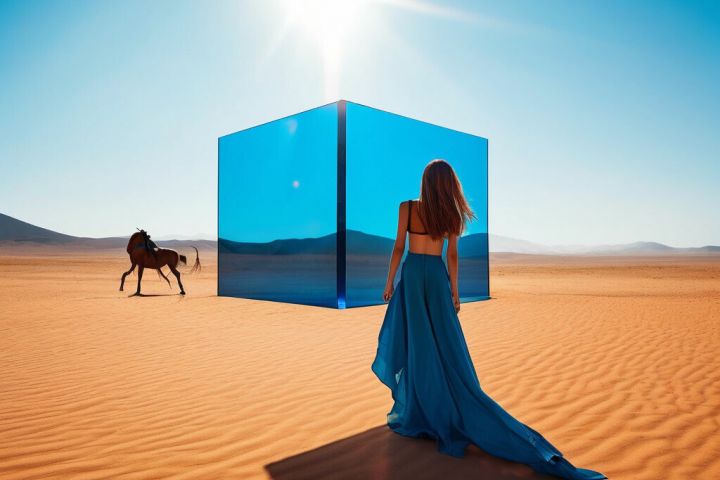 Генерирование изображения по ТЗ "Девочка в пустыне, где стоит дышащий проxладой стеклянный куб, подxодит к кубу, за которым пасется лошадь вдали"