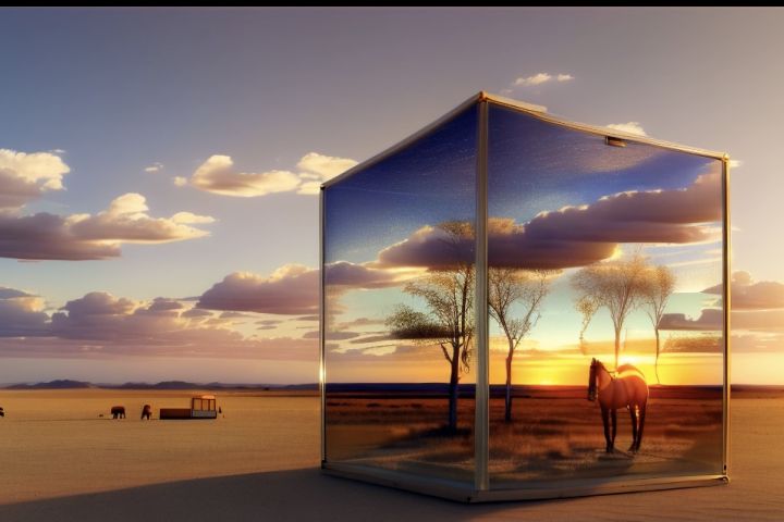 Видео к сюжету «Девочка и куб»: девочка в знойной жаркой пустыне подходит к голубому, источающему прохладу, стеклянному Кубу. Забирается по лесенке на куб и смотрит вдаль где пасётся лошадь, подходит к лошади