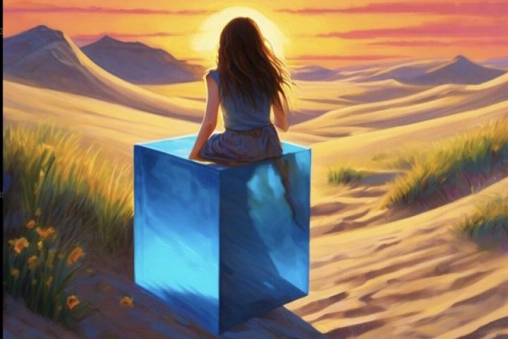 Генерирование видео по ТЗ: девочка в пустыне, подходит к прозрачному кубу, забирается на куб, смотрит в Даль