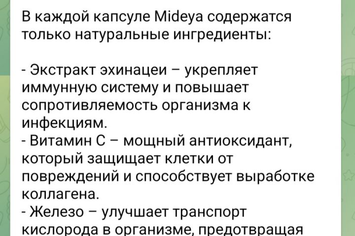 Работа представляет собой рекламный текст о пищевых добавках Mideya, направленных на улучшение общего состояния здоровья. В тексте подчеркиваются некоторые ключевые моменты.