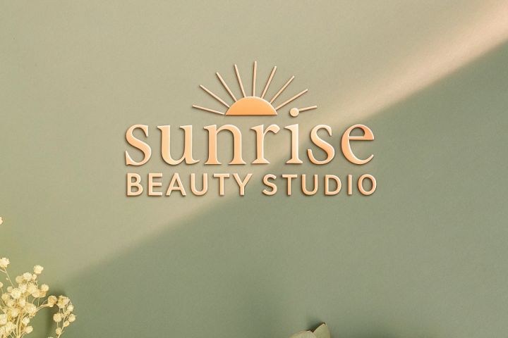 Стиль минимализм: мягкие пастельные тона (пудрово-розовый, светло-бежевый, нежный персиковый), изящный и утончённый шрифт, утреннее солнце в виде полукруга или тонкой линии с лучами, возможно, легкий акцент на природных элементах (листья, цветы). Логотип должен выглядеть современно, изысканно и гармонично."
