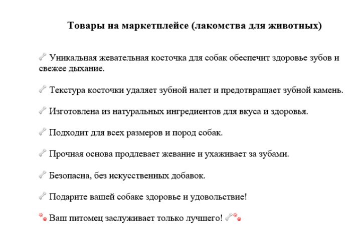 Описание товара для маркетплейса. Категория: лакомства для животных (собак)