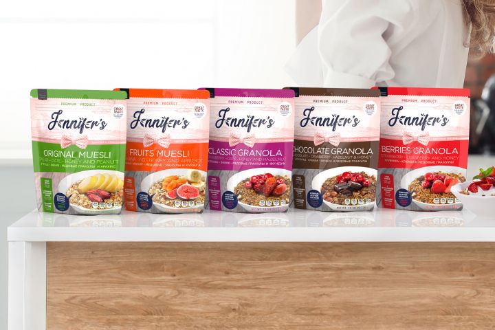 Дизайн уже используется — первые партии в магазинах. Планируется расширение линейки (батончики, другие мюсли). Клиент на долгосрочном сотрудничестве.
