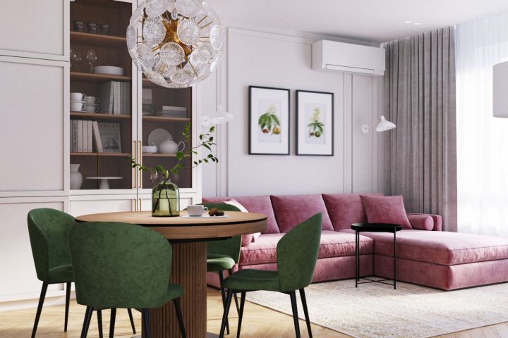 Вид на гостиную со стороны кухни. Над столом винтажная люстра "Спутник".