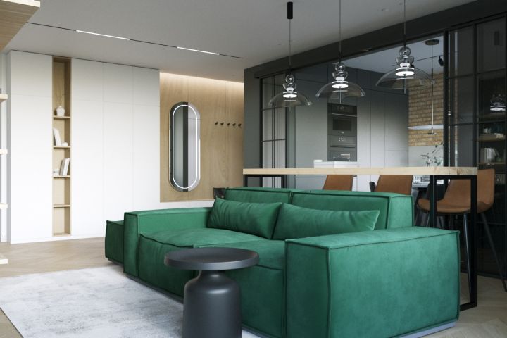 Квартира с элементами лофта. Цветовое решение: контрастная игра светлых и тёмных оттенков с яркими акцентами.