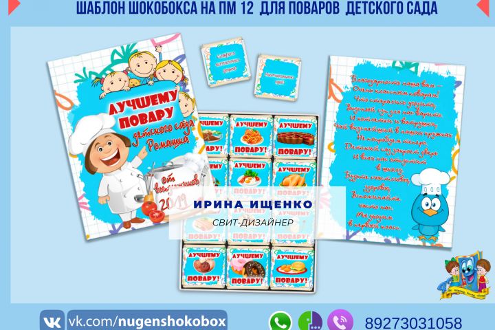 Дизайн шокобокса под конфеты "Птичье молоко" на 12 конфет. В состав шокобокса входят коробочка и фантики. Возможна замена надписей. Шаблон высылается в электронном виде, печать на фотобумаге, матовая, плотностью от 170г/м.кв. Возможно изготовление под ключ. Конфеты приобретаются заказчиком самостоятельно.