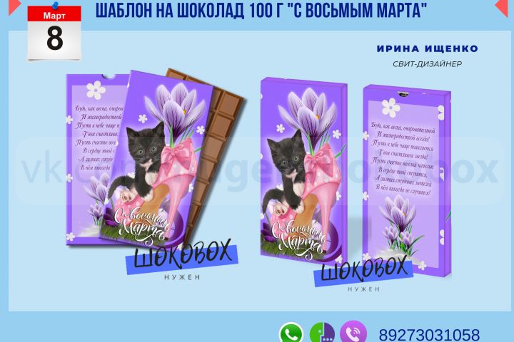 Шаблон разработан для шоколада плиточного массой 80,90,100г. Возможна замена цвета, надписей. Шаблон высылается в электронном виде , печать на фотобумаге (предпочтительнее), матовая, плотность от 170 г/м.кв.