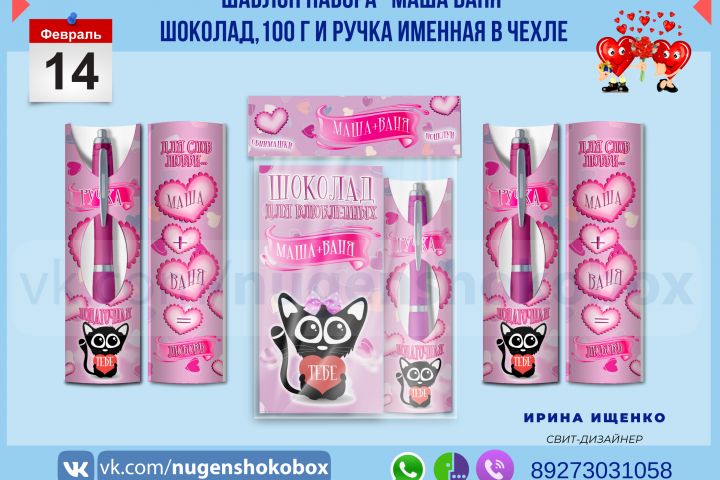 Дизайн подарочного набора "Маша+Ваня". Состав: челол для ручки, упаковка для шоколада. Любые надписи, любой цвет.