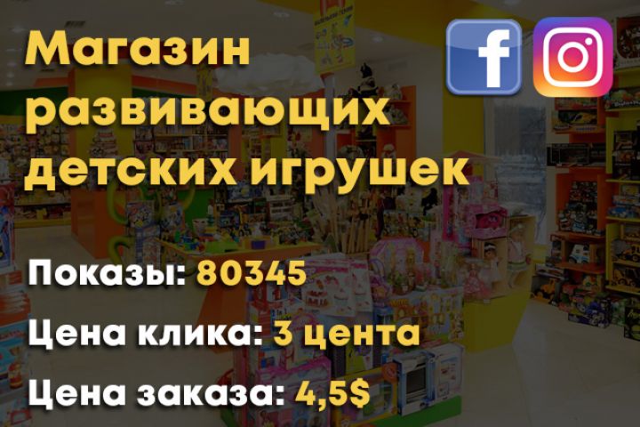 Настройка рекламы была под клики на сайт, так как пиксель конверсии нормально не устанавливался. Средняя цена клика 3 цента. Цена заказа 4-5 долларов.