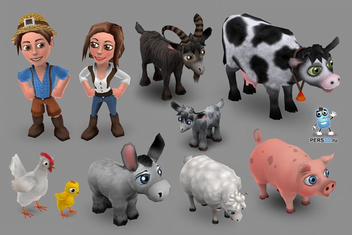 3D персонажи для игры в жанре фермы с анимацией. Животные и главные герои для игры "Фермерские Деньки" - овцы, козы, куры, коровы, ослик поросёнок, а так же мужской и женский персонаж. Все модели низкополигональные. Анимацию можно посомтреть по ссылке.