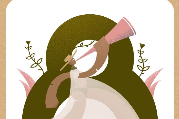 Открытка к 8 марта, женщина дует в трубу, возвещая о празднике на фоне цифры 8