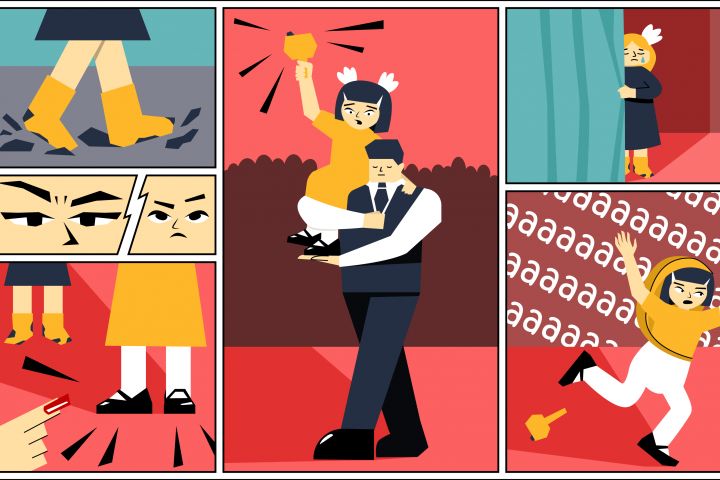 - девочка с колокольчиком наконец слезает с плеча старшеклассника, но каким-то образом подол ее платья оказывается у нее на голове и она в панике убегает со сцены.