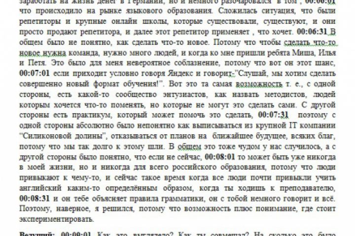 Транскрибация может быть выполнена: 1. Дословно; 2. С редактированием; 3. С тайм-кодами или текстом.