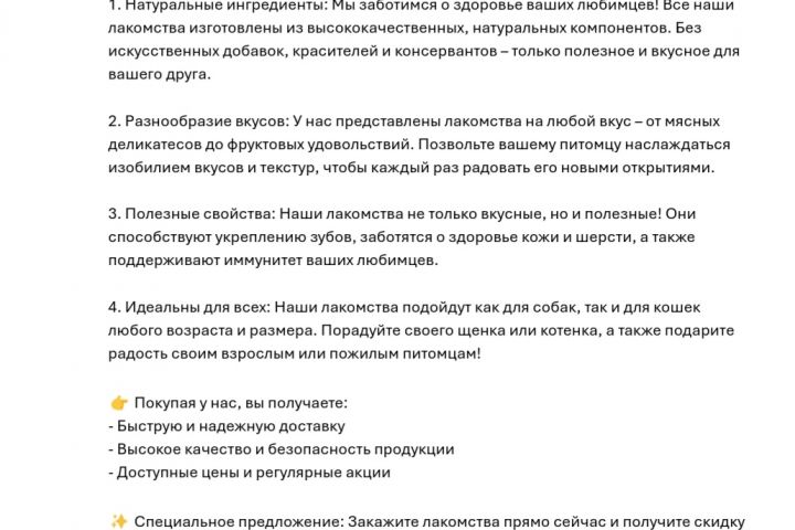 Рекламный текст для бренда лакомств для животных (на маркетплейс)