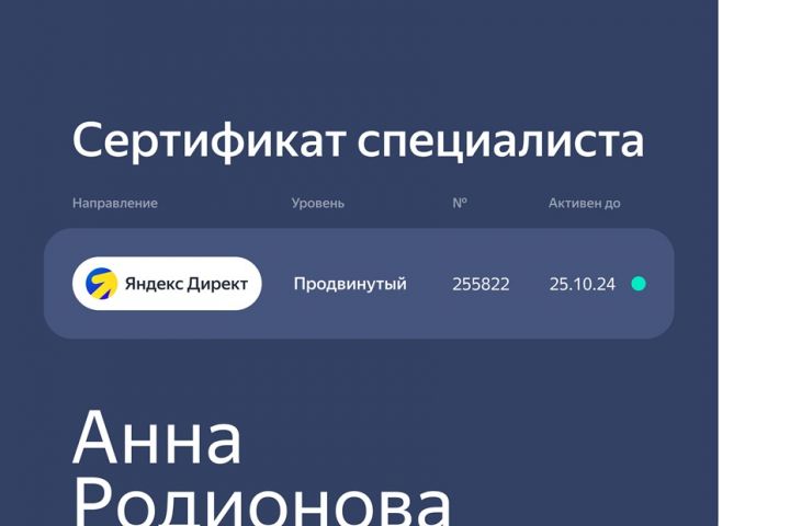 Официальный сертификат Яндекс.Директ продвинутого уровня.