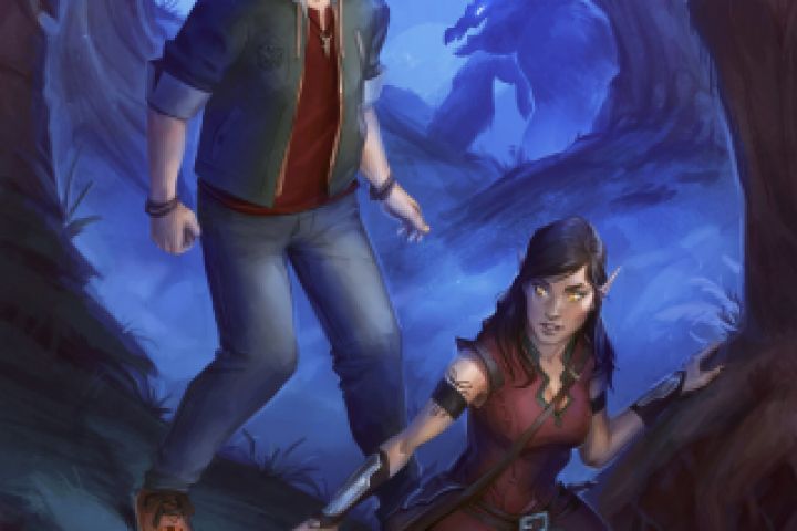 Иллюстрация к обложке книги в жанре фэнтези "Волшебник с планеты Земля". Эльфийка и Парень с Земли в тёмном лесу.