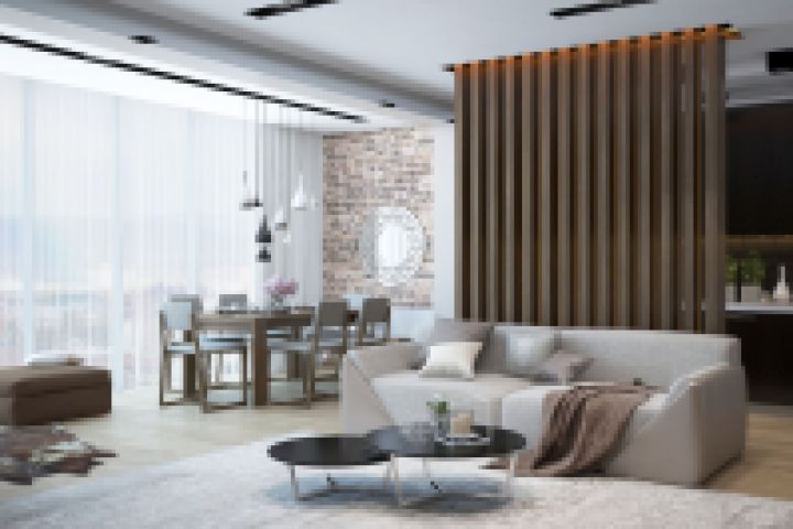 Гостиная-студия в двухкомнатной квартире для молодой пары, любящей комфорт и функциональность. Современный стиль, подчеркнутая простота форм.