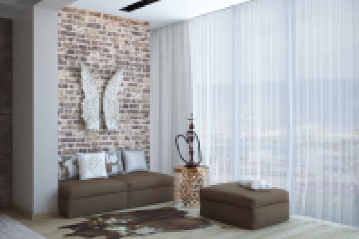 Гостиная-студия в двухкомнатной квартире для молодой пары, любящей комфорт и функциональность. Современный стиль, подчеркнутая простота форм.