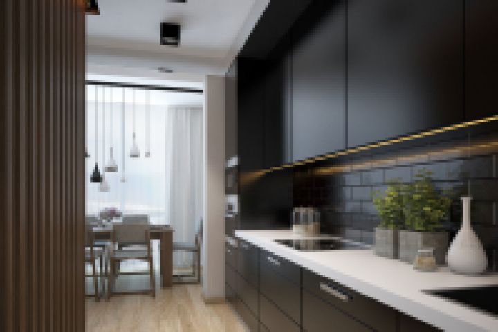 Кухня-студия в двухкомнатной квартире для молодой пары, любящей комфорт и функциональность. Современный стиль, подчеркнутая простота форм.