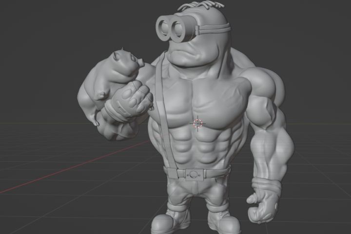 Оригинальная 3D-модель персонажа — миньон с гипертрофированной мускулатурой, держащий свинью на руках. Создана для 3D-печати с акцентом на юмористический и необычный стиль.
