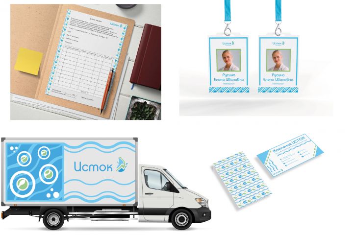 Айдентика компании Исток, включающая в себя: - бланк - бейдж - транспорт - визитку