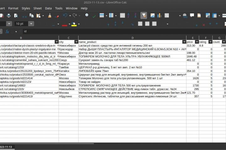 Парсер проходит по каждой ссылке и городу, которые были указаны в csv файле, и собирает по требуемому товару наименьшую цену, рейтинг, и количество отзывов.