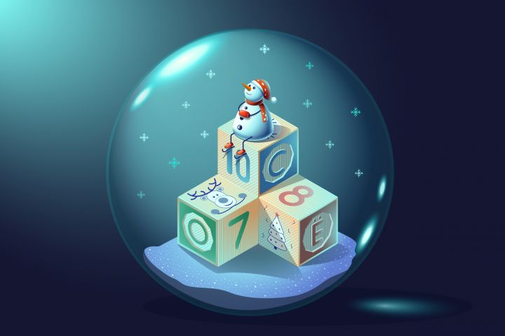 Идея создать ряд иллюстраций на тему снежный шар родилась ещё в 2020 г. Тогда на курсе по Adobe Illustrator была тема “изометрия”, и я решила нарисовать снежный шар, внутри которого можно разглядеть детский кубик со снеговиком наверху.