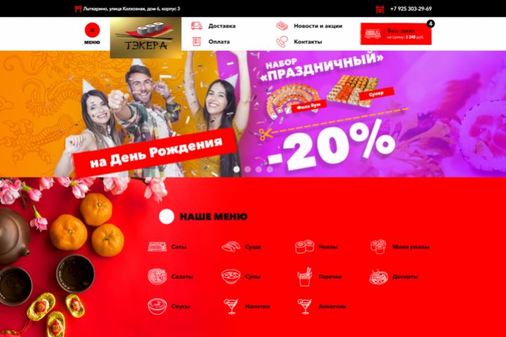 Дизайн, адаптивная вёрстка и разработка сайта суши-бара «Тэкера», г. Лыткарино. MODX Revo, miniShop2, UIkit