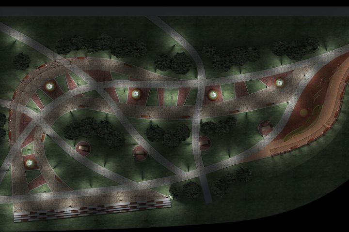 3д-визуализация ночного вида проекта благоустройства для расчета освещенности. Генплан.