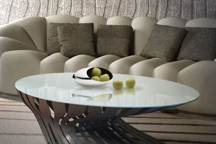 Стеклянный стол на металлическом пластичном перфорированном подстолье.