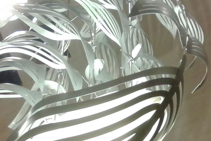 Большой подвесной современный светильник в интерьере во форме парусника. Алюминий, диодная подсветка. Световой декор частного дома.