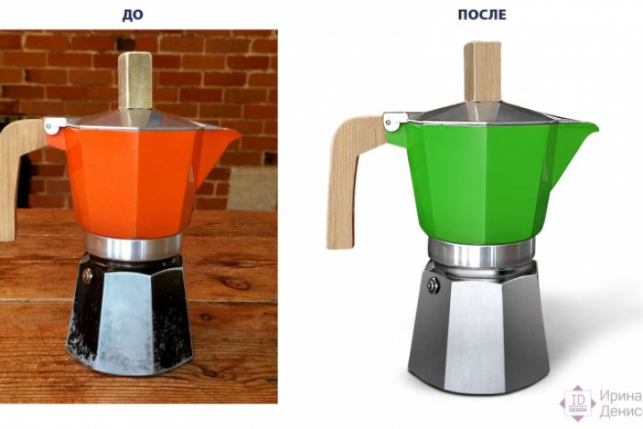 Кофеварка: ретушь, замена цвета, монтаж и дорисовка металлической нижней части и деревянных частей. Замена фона, дорисовка тени.