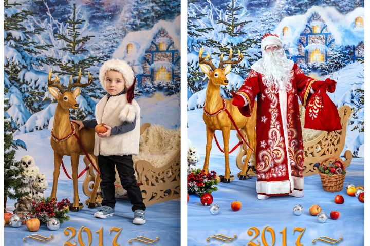 Была поставлена и выполнена задача: реалистично вписать фото Деда Мороза вместо мальчика в окружающую среду, фотомонтаж яблок и корзинки. Мальчик был удалён путем дорисовки и коллажа, итоговое изображение обработано, в том числе выполнена цветокоррекция.
