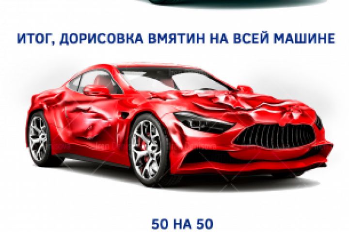 Была поставлена и выполнена задача: проиллюстрировать услугу "Удаление вмятин" для сайта автосервиса. Исходное фото: новая, чистая, красивая машина. На ней были отрисованы вмятины, чтобы показать машину до удаления вмятин и после.