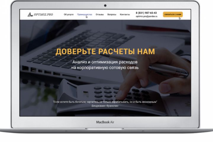 Требовалось разработать Landing Page в лаконично-деловом стиле, преимущественно в темных тонах, с кнопкой Связаться с нами, блоком вопросы-ответы и формой обратной связи.