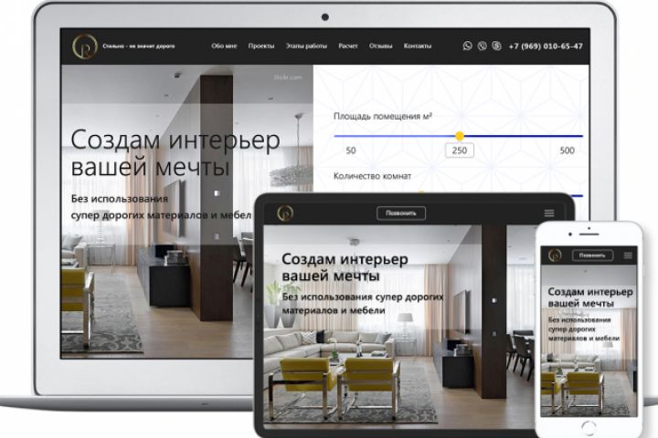 Лендинг для частного дизайнера интерьеров. Разработка дизайна, верстка, адаптация под мобильные устройства.