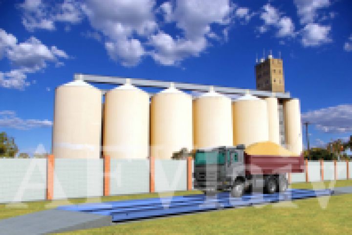 Изображение автомобильных весов с грузовиком на фоне элеватора