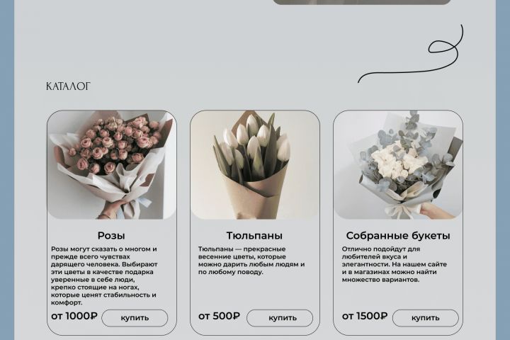 Я разработала стильный и современный дизайн для сайта цветочного магазина, который подчеркивает эстетику и профессионализм бренда. Сайт предназначен для демонстрации ассортимента продукции, улучшения пользовательского опыта и увеличения конверсии заказов.