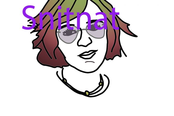 Funny portrait of a smiling relaxed girl with multicolored hair and evening makeup. Digital image of a human head on a pink-peach background. Charming expressive female face in a sunny oval frame.