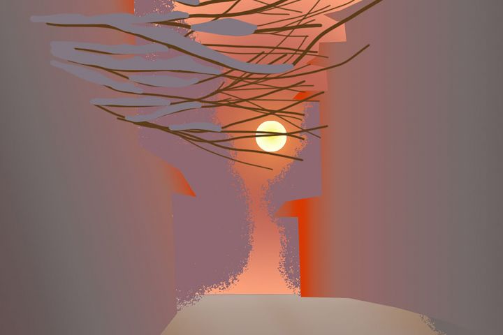 Стилизованная геометрическая вечерняя городская улица со снежными ветвями, уходящая в закатное небо с круглым белым солнцем.