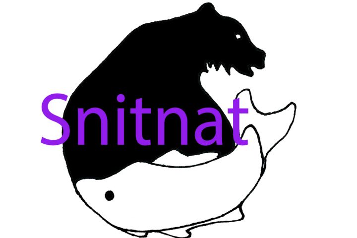 Isolated black and white cartoon image of a brutal bear and a carp fish. Decorative digital illustration. Yin-yang harmony symbol. A moment of the forest wildlife. Creative logo.
