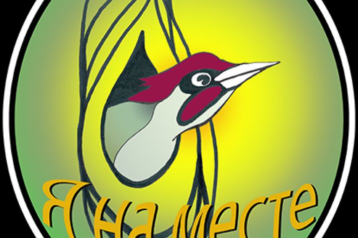 Cartoon digital image of a green woodpecker with a red head. Funny colorful mascot for kids print. A cute bird on the oval background in emerald-yellow gradient. Black contour lines and bright colors.