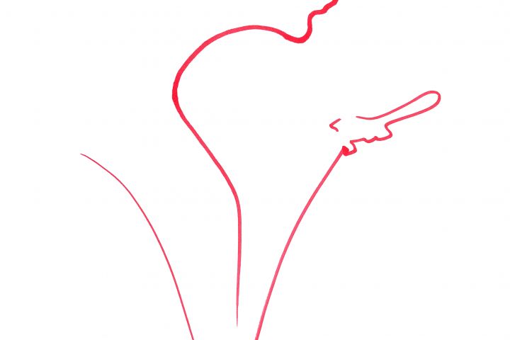 Набор волнистых красных линий, похожих на профиль мужчины с вьющимися волосами, указывающего куда-то пальцем. Оригинальный дизайн простых вещей
