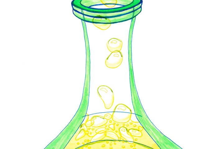 Зелёная прозрачная бутылочка с золотой пузырящейся жидкостью